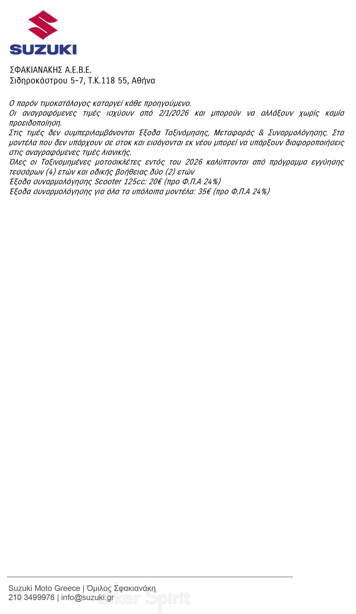 Η Suzuki Moto Greece παρουσιάζει τον νέο τιμοκατάλογο λιανικής για το 2026 για όλα τα μοντέλα της γκάμας, προσφέροντας κορυφαία ποιότητα και αυθεντική οδηγική εμπειρία σε κάθε κατηγορία.Ο νέος τιμοκατάλογος προσφέρει επιλογές για κάθε μοτοσυκλετιστή, με την αξιοπιστία και την ποιότητα που χαρακτηρίζουν τη Suzuki.